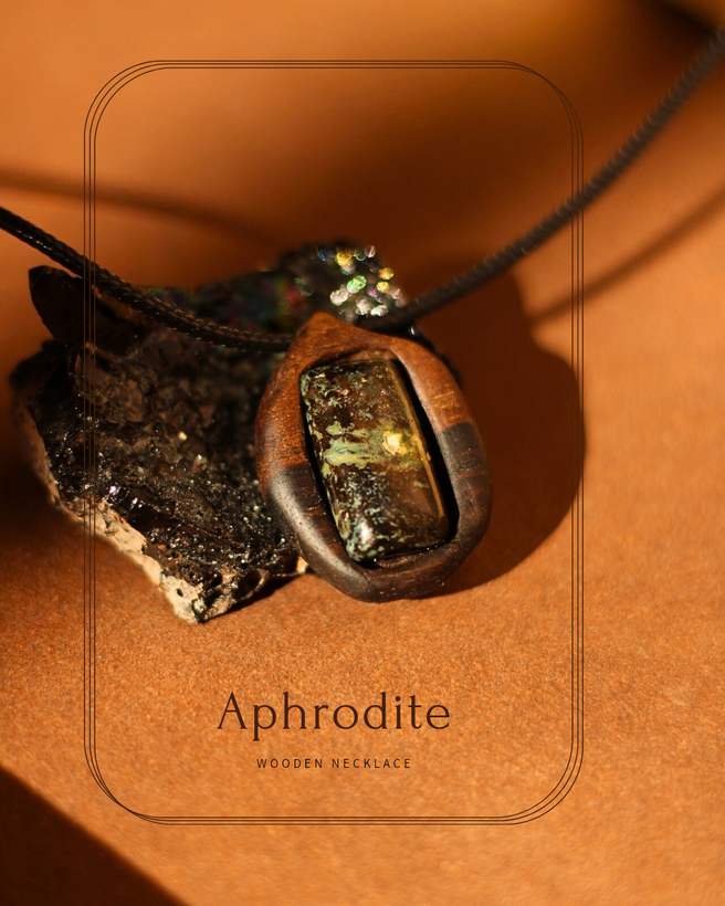 گردنبند چوب گردو و سنگ عقیق خزه ای بند چرم مصنوعی